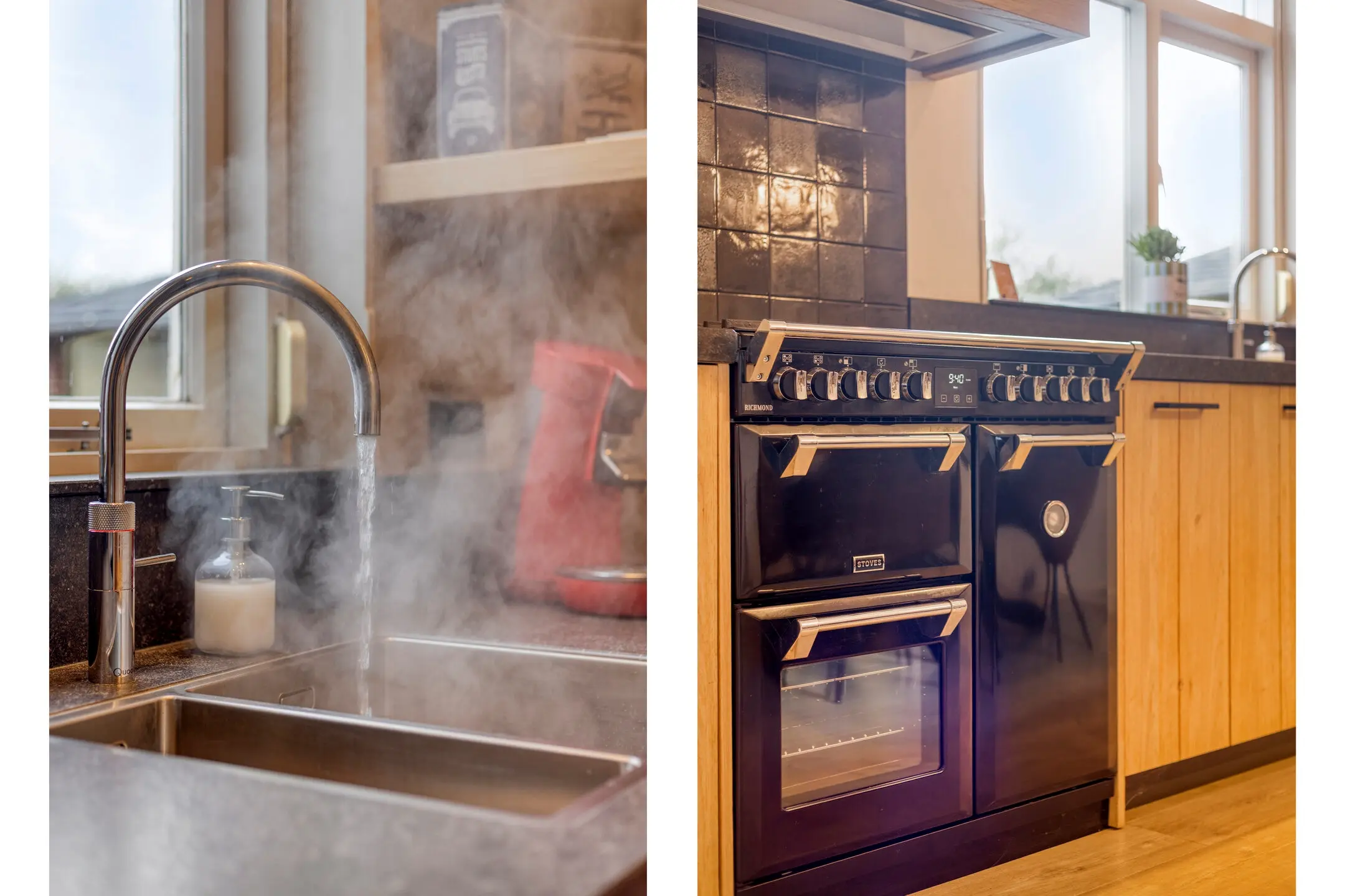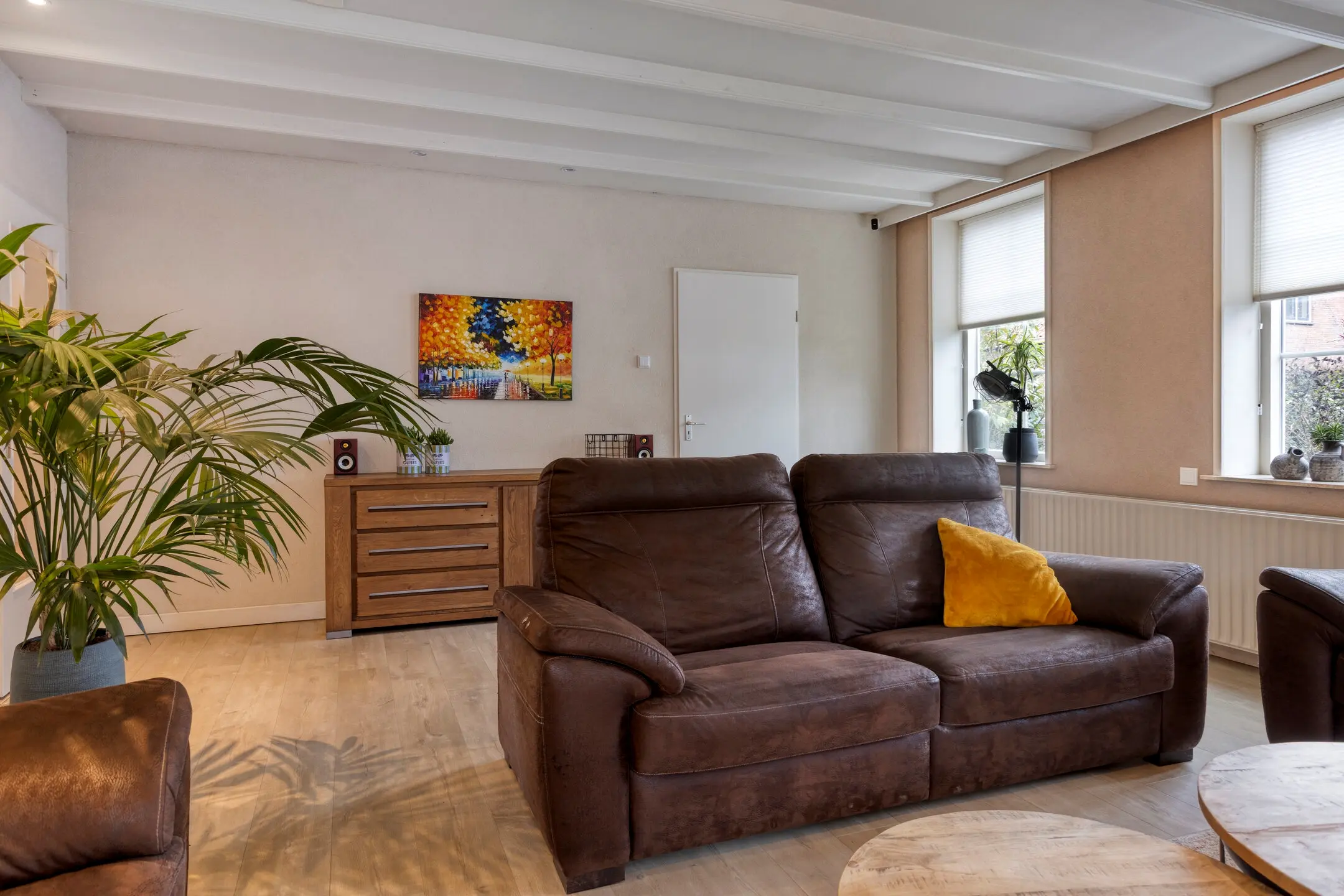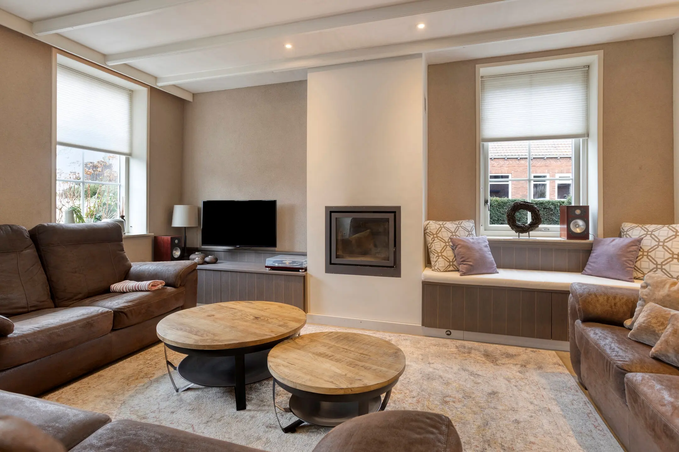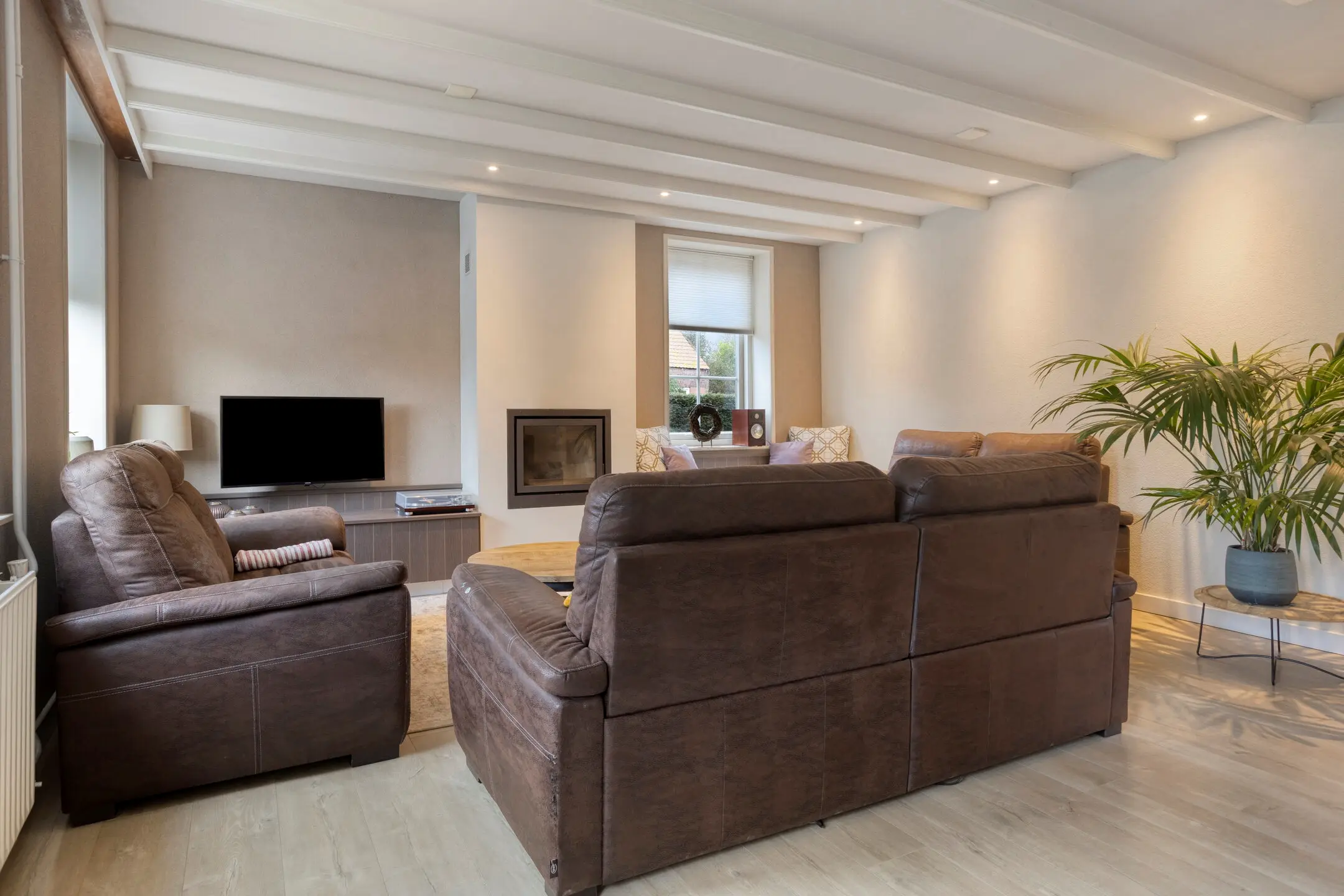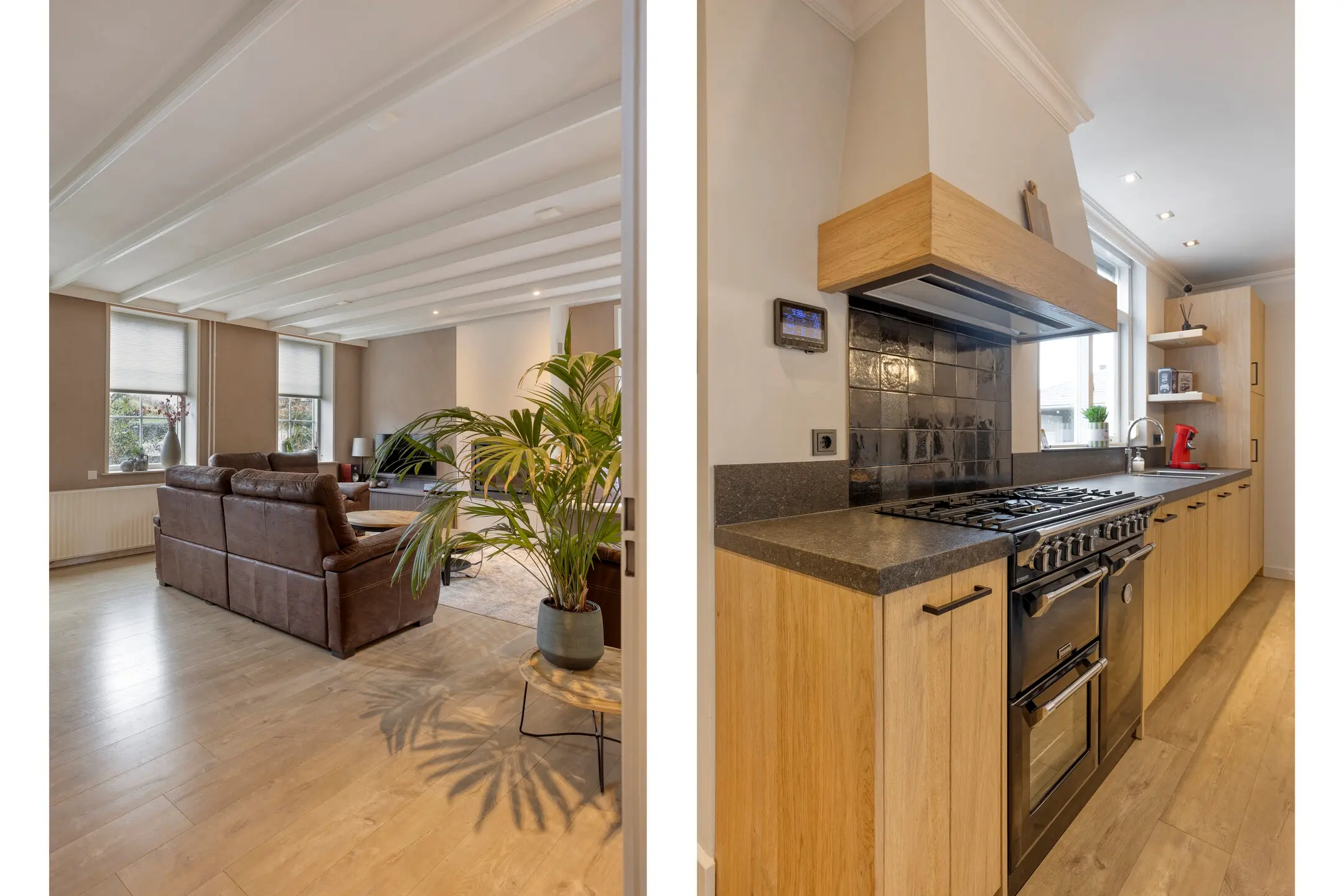 Sfeer en comfort, bij binnenkomst valt direct de royale woonkamer op, voorzien van een sfeervolle open haard en een nette laminaatvloer. Het hart van het huis is de landelijke massief houten keuken van Pieters. Deze is van alle gemakken voorzien, een Stoves fornuis (5-pits met 3 ovens) voor de kookliefhebber, een Quooker, vaatwasser en koelkast. Ook hier zorgt een tweede open haard voor extra gezelligheid.