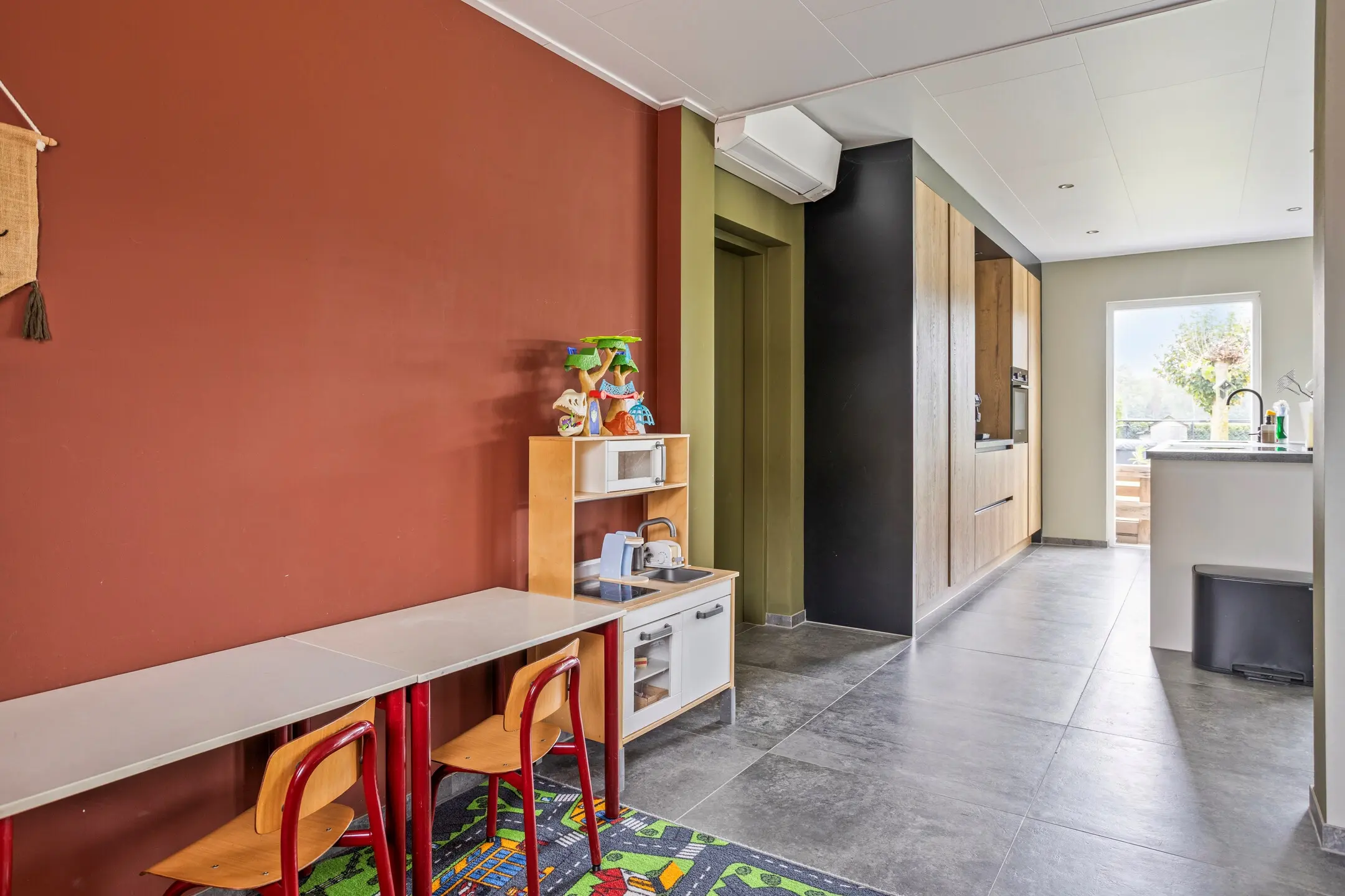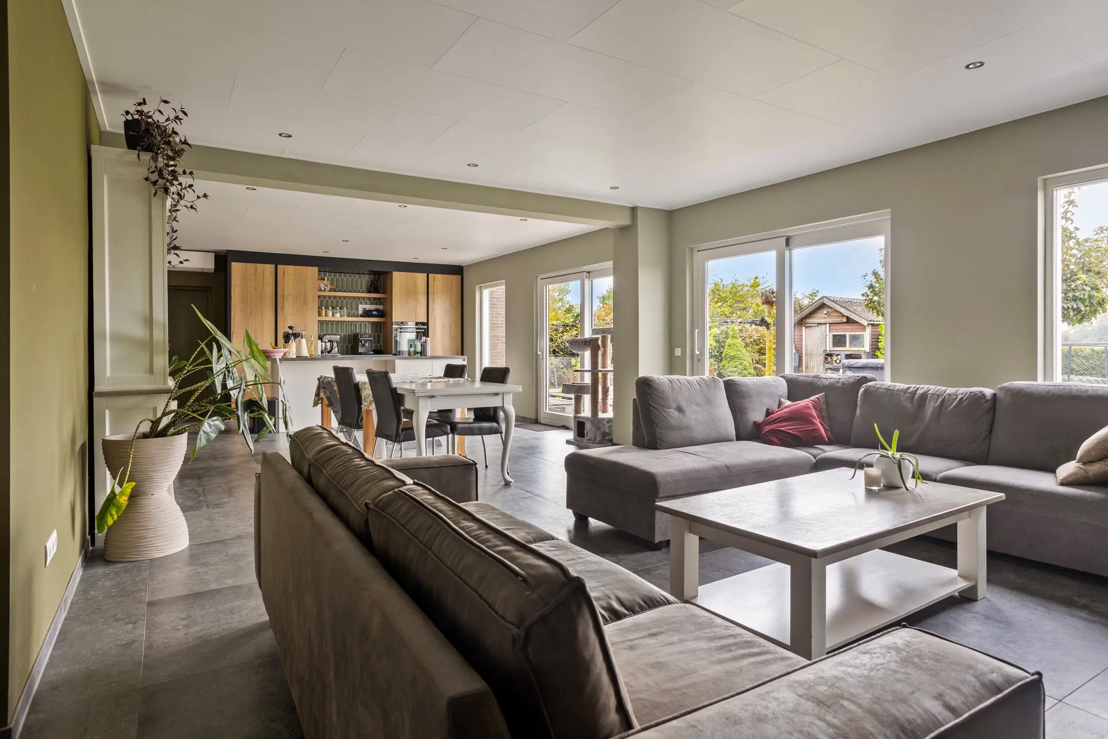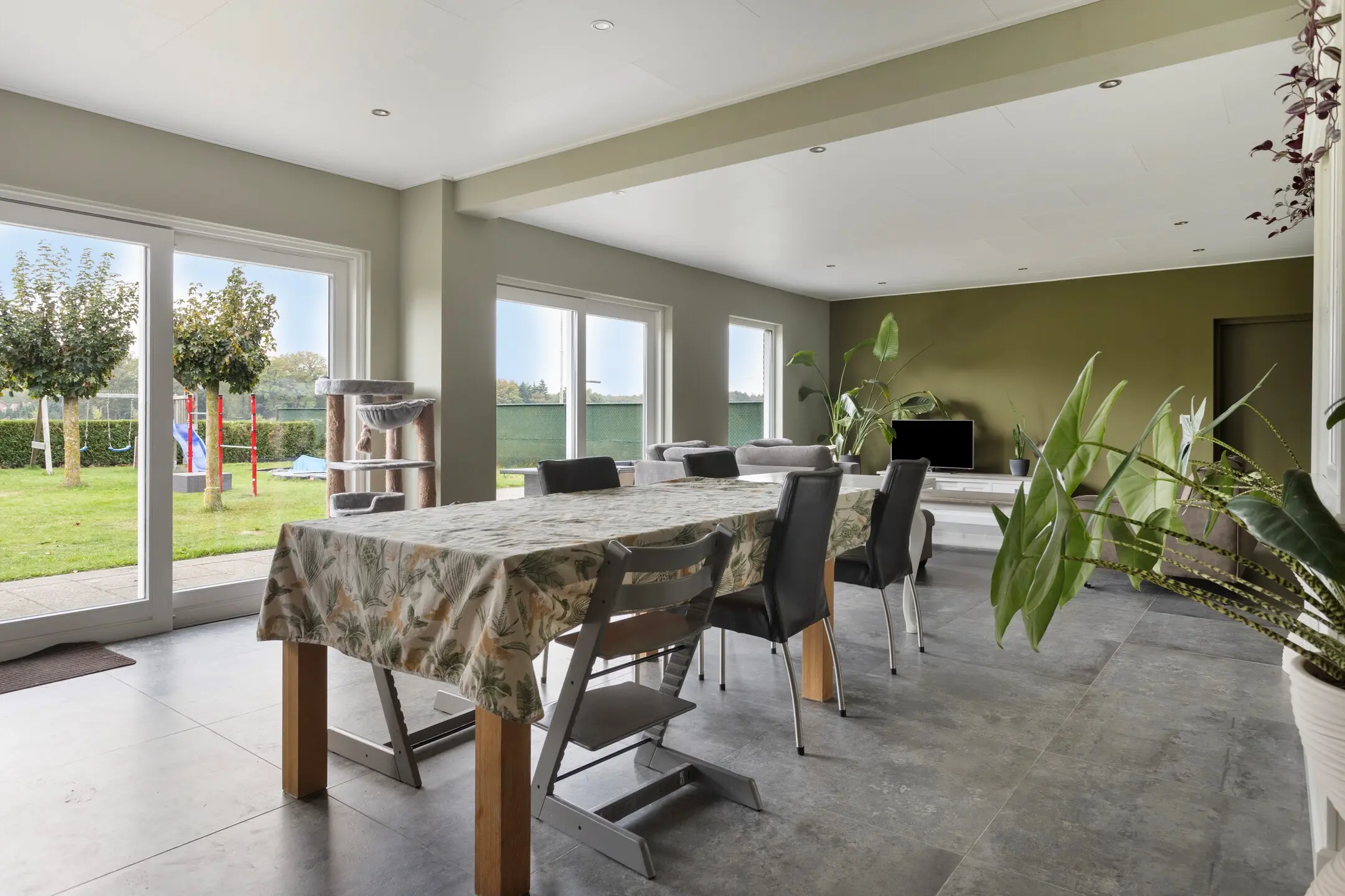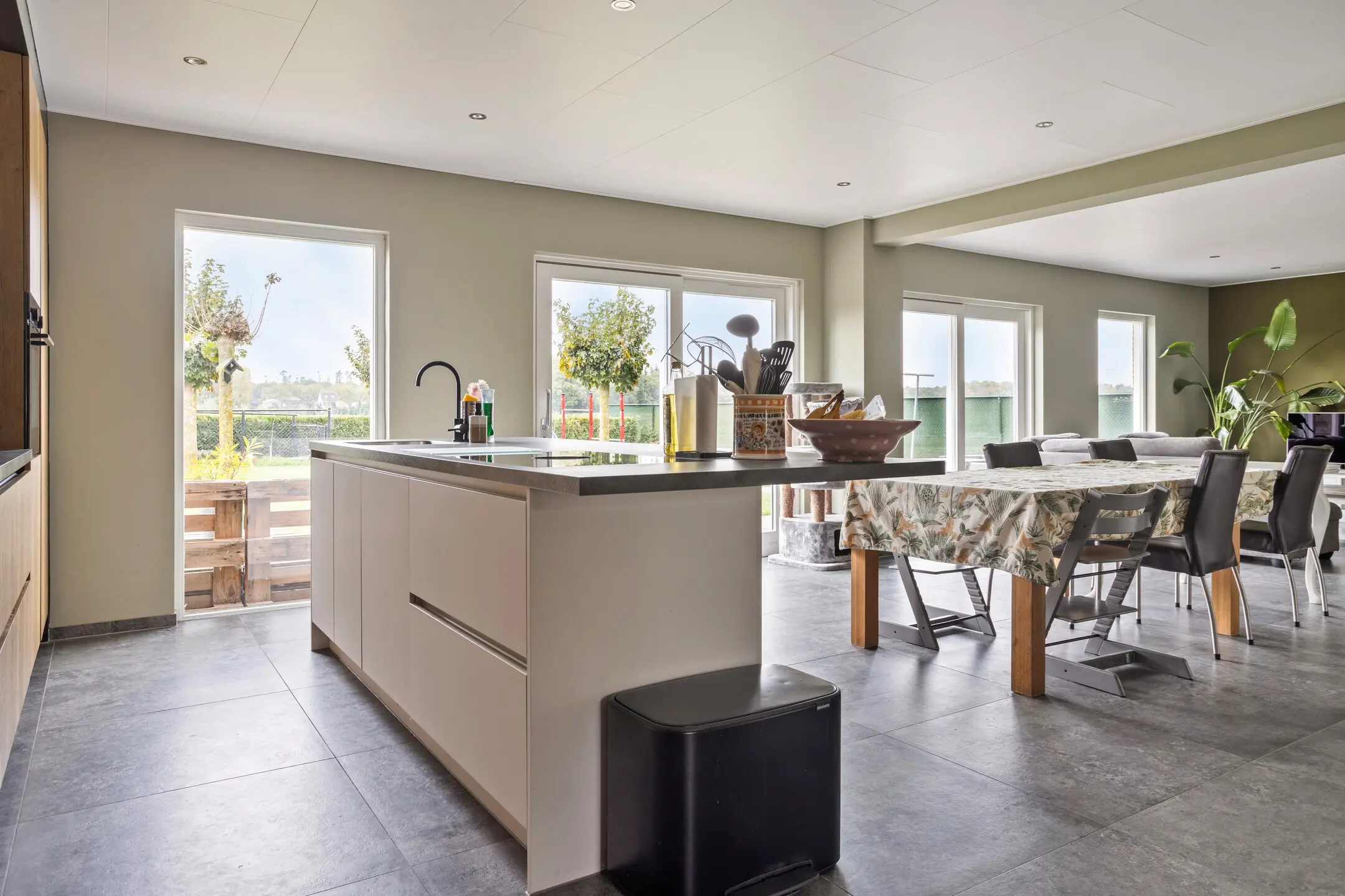 De woonkamer is bijzonder royaal en licht, met een hoogwaardige open keuken voorzien van topapparatuur: Bora inductiekookplaat, oven, koelkast, vaatwasser en boiler. Twee grote schuifpuien verbinden de leefruimte naadloos met de zonnige tuin, waardoor binnen en buiten één geheel vormen en u volop kunt genieten van het uitzicht.