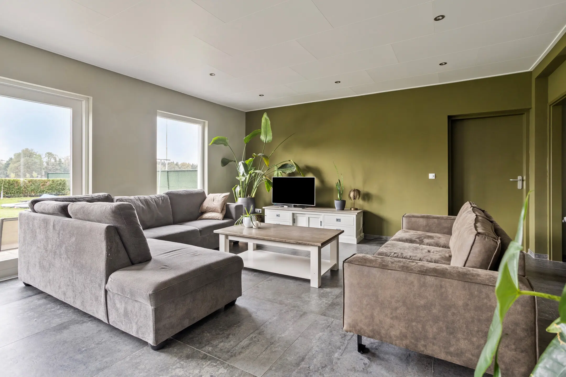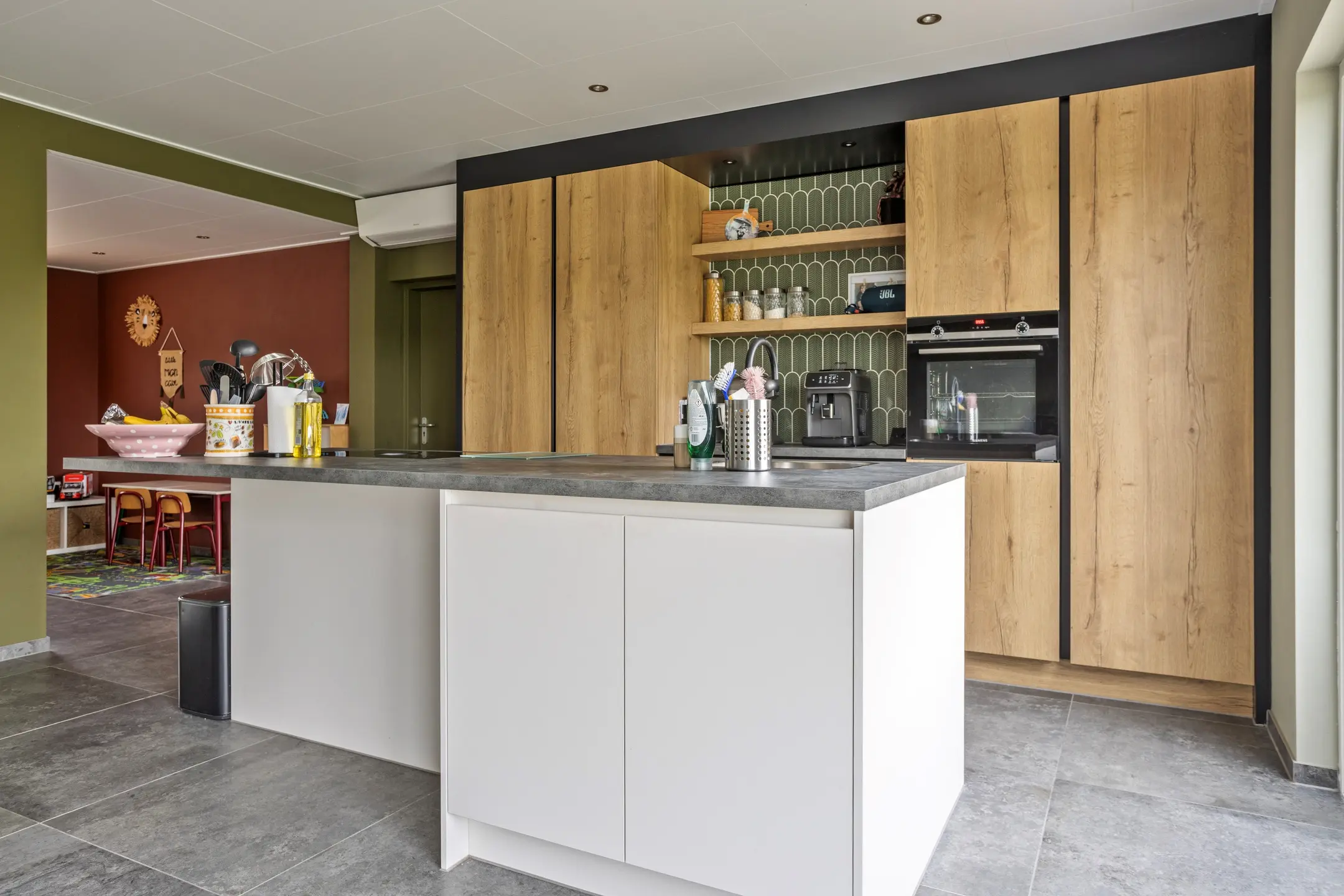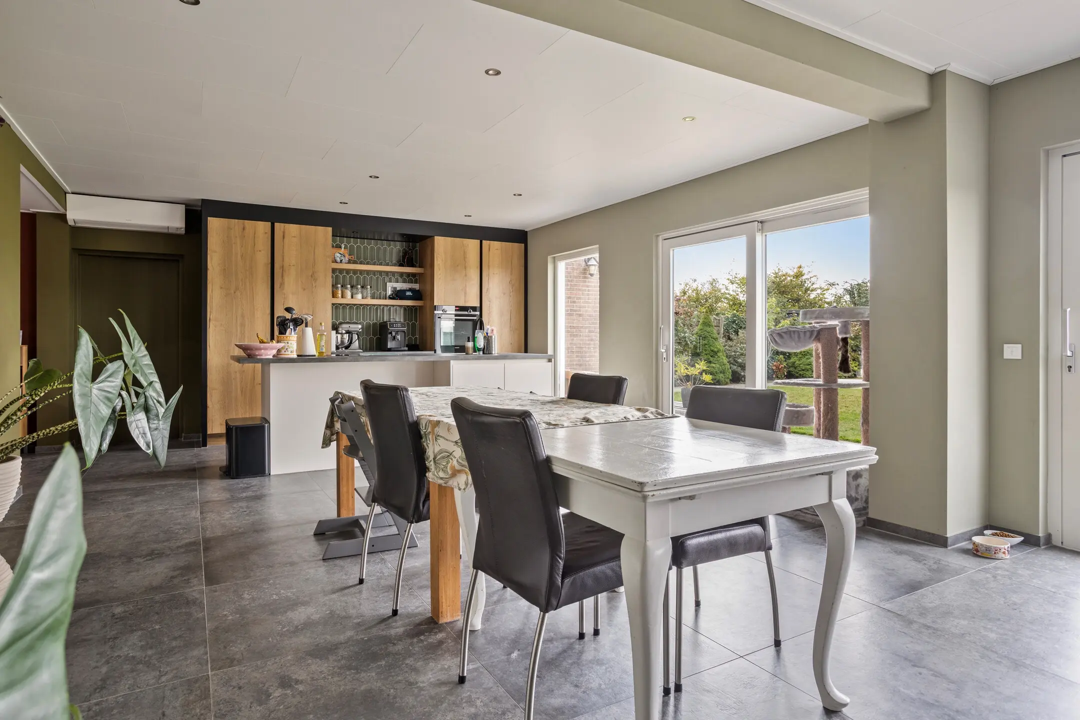 De woonkamer is bijzonder royaal en licht, met een hoogwaardige open keuken voorzien van topapparatuur: Bora inductiekookplaat, oven, koelkast, vaatwasser en boiler. Twee grote schuifpuien verbinden de leefruimte naadloos met de zonnige tuin, waardoor binnen en buiten één geheel vormen en u volop kunt genieten van het uitzicht.