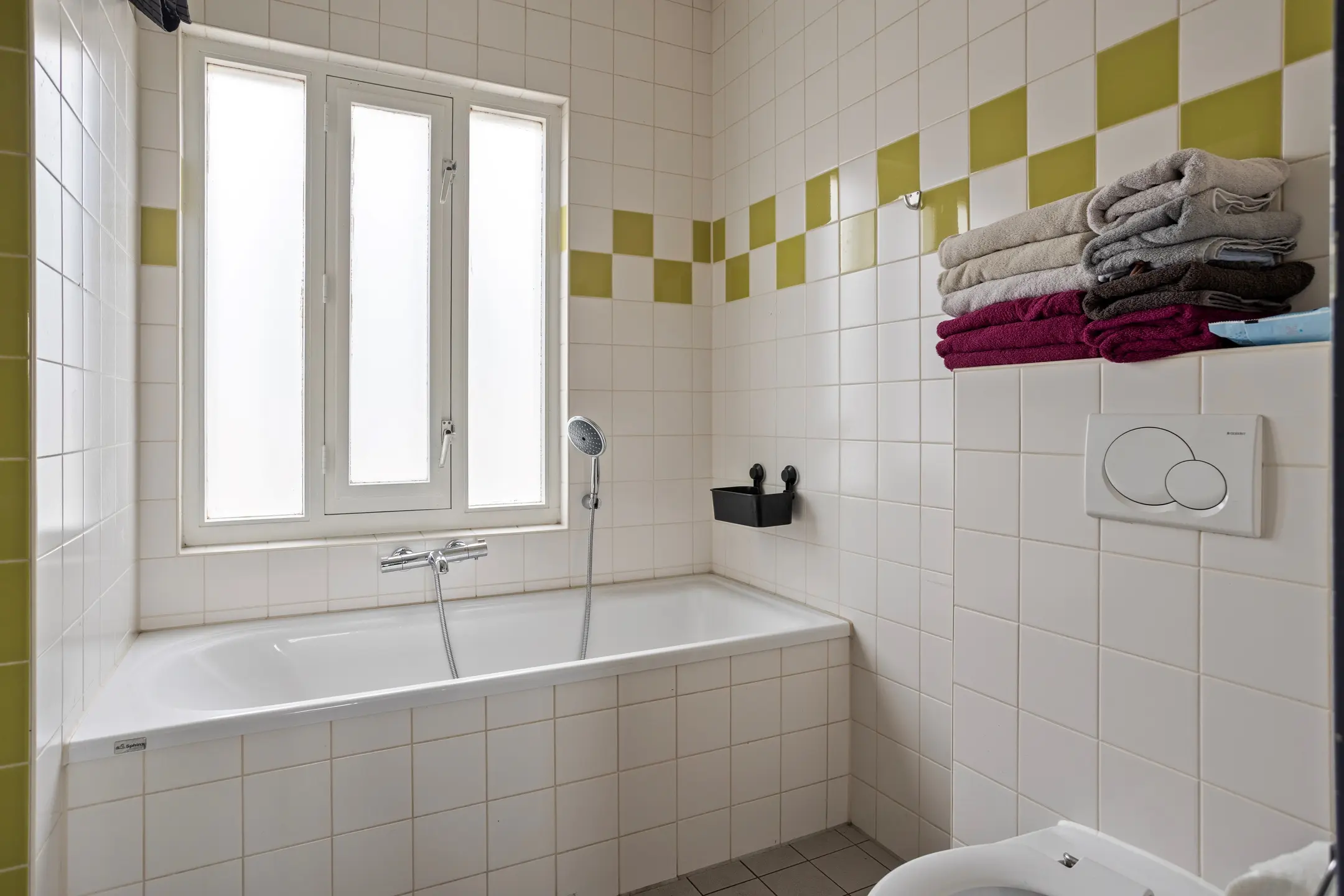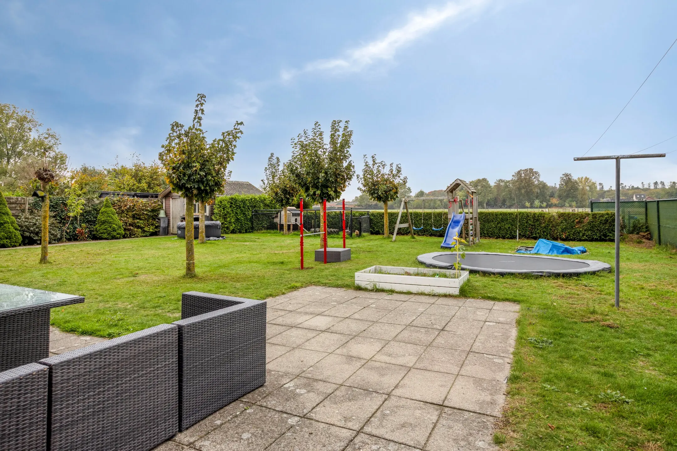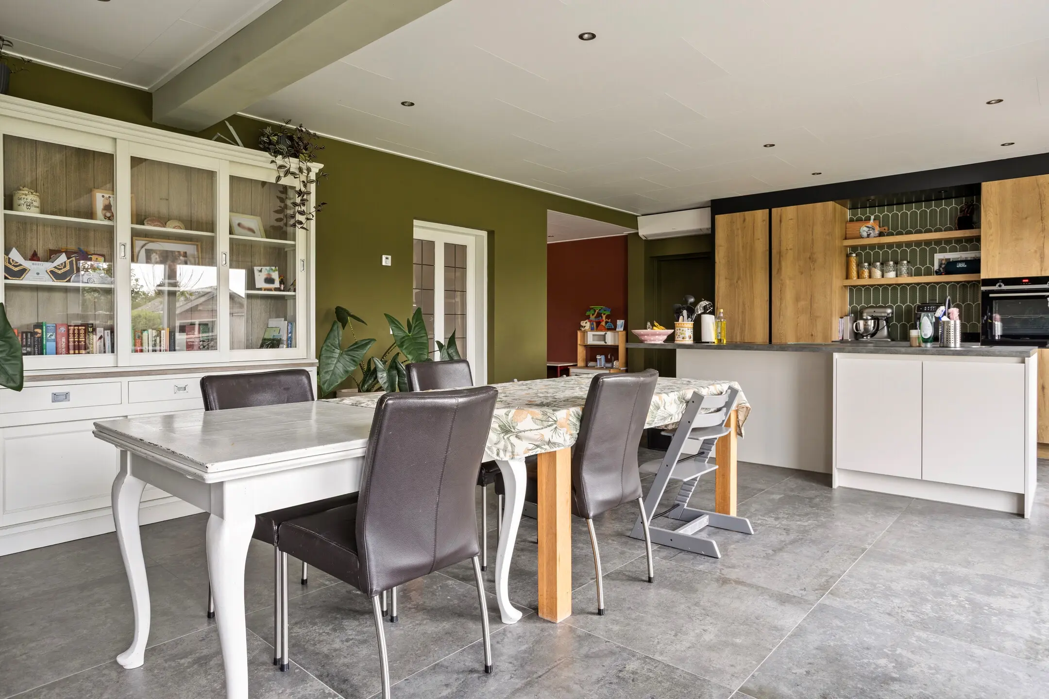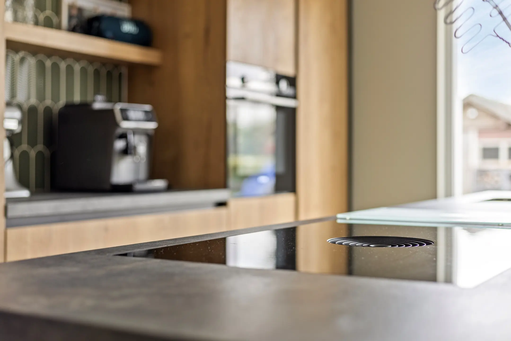 De woonkamer is bijzonder royaal en licht, met een hoogwaardige open keuken voorzien van topapparatuur: Bora inductiekookplaat, oven, koelkast, vaatwasser en boiler. Twee grote schuifpuien verbinden de leefruimte naadloos met de zonnige tuin, waardoor binnen en buiten één geheel vormen en u volop kunt genieten van het uitzicht.