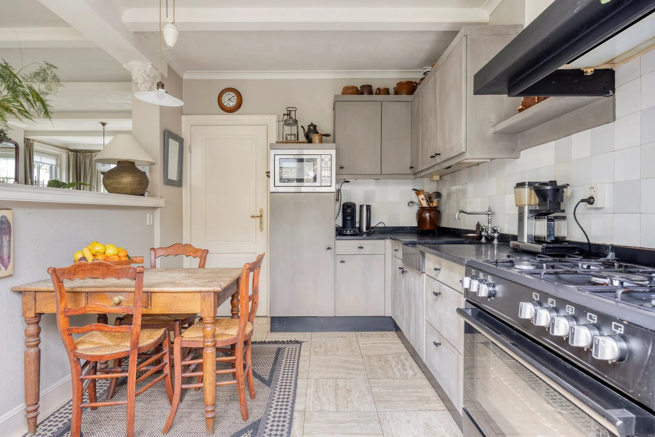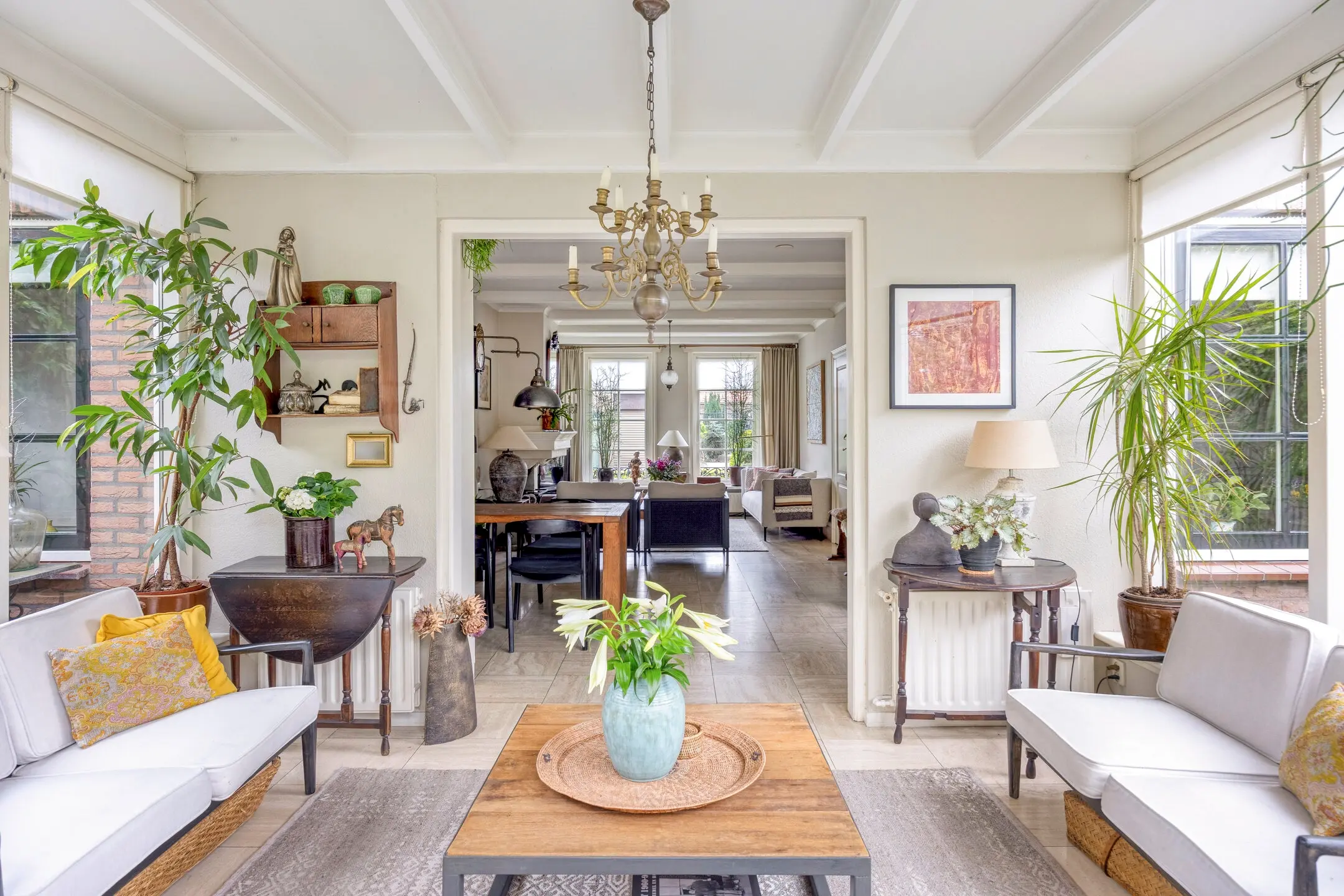 Bij binnenkomst wordt u verwelkomd door een royale hal die direct de toon zet voor de rest van de woning, licht, luchtig en gastvrij. De T-vormige woonkamer vormt het kloppende hart van het huis. Hier is genoeg plek voor een riante zithoek bij het raam en een lange eettafel waar u urenlang kunt tafelen met vrienden en familie. De open keuken nodigt uit tot culinaire avonturen, terwijl de aangrenzende serre de perfecte plek is om met een goed boek en een glas wijn te genieten van het binnenvallende daglicht.