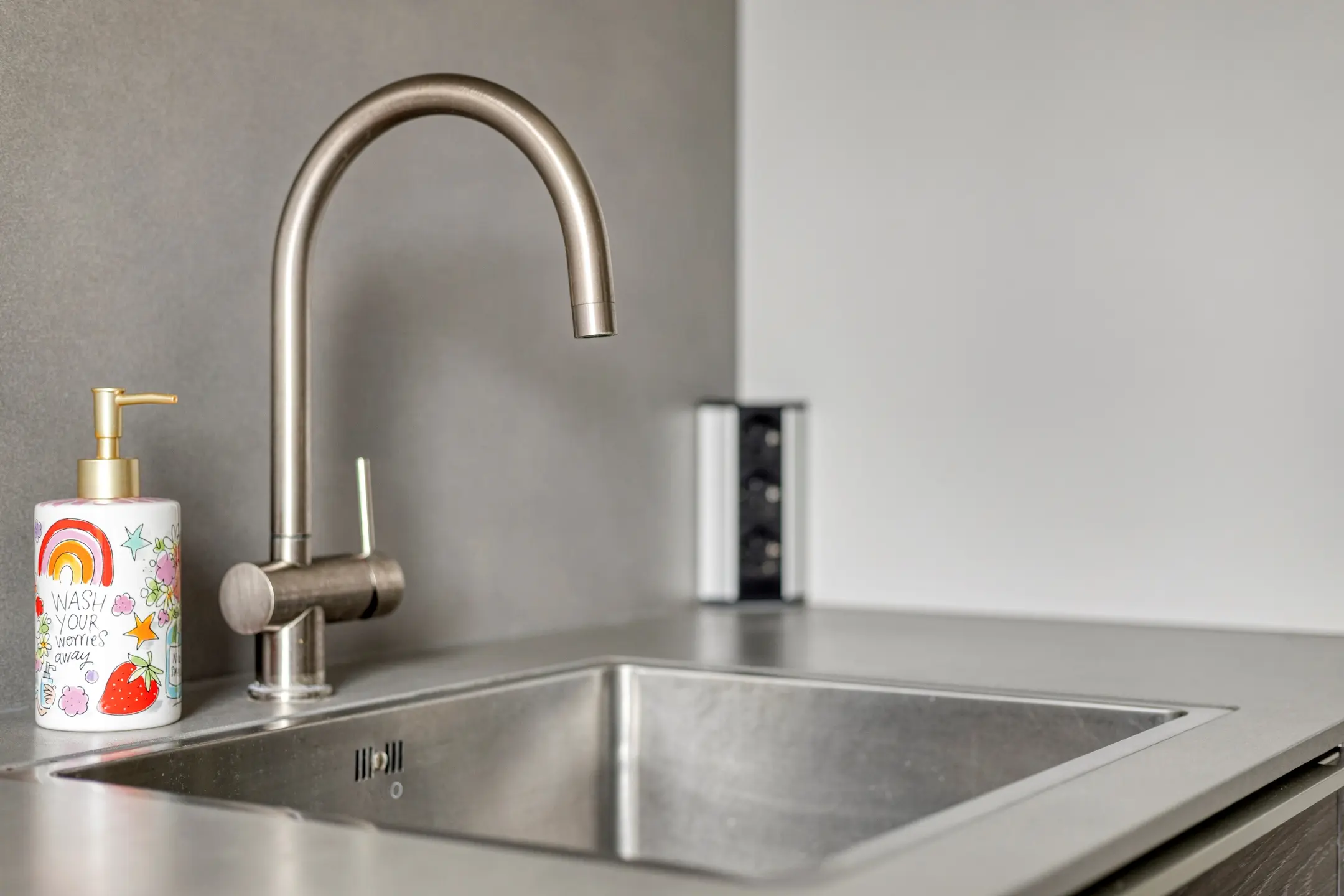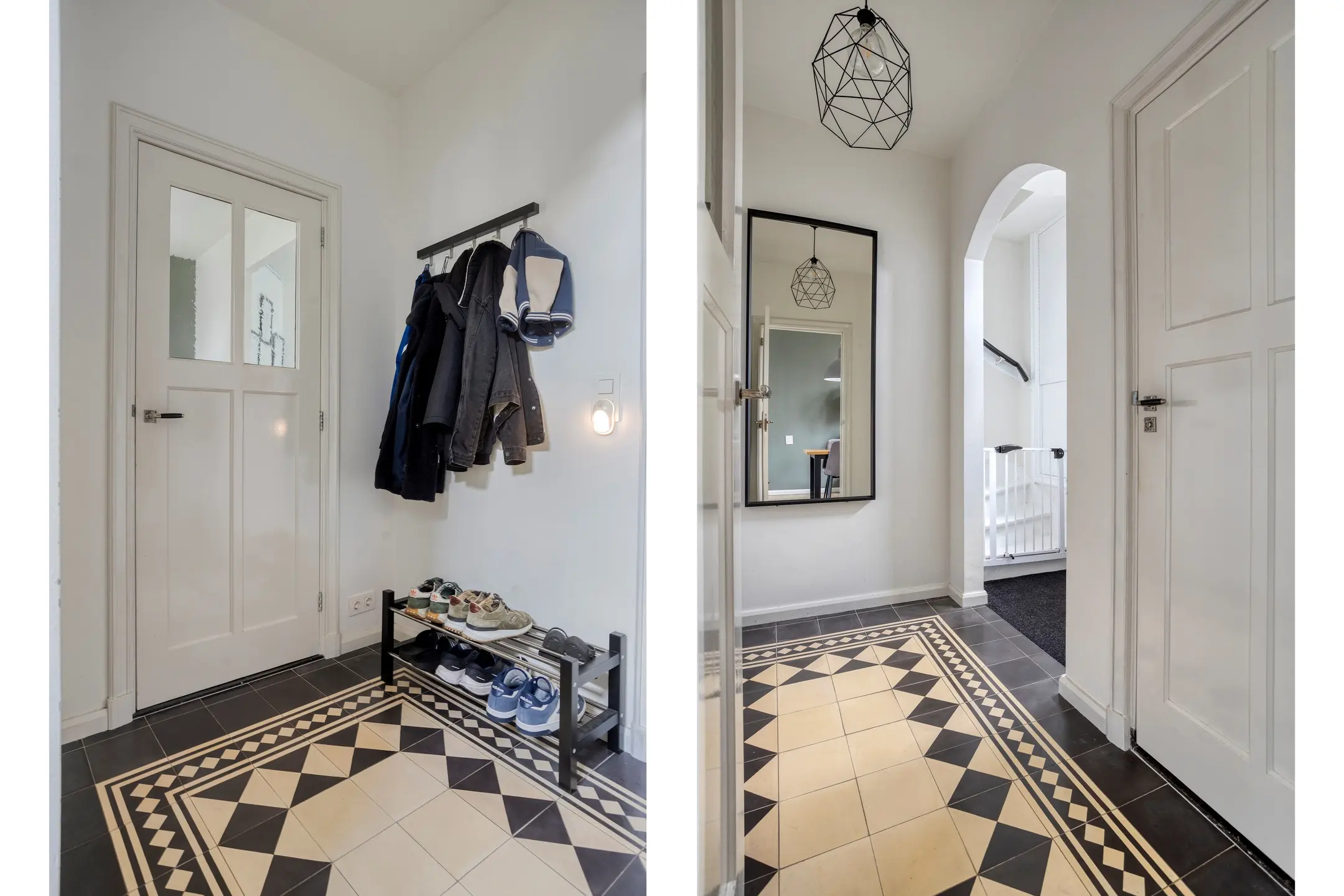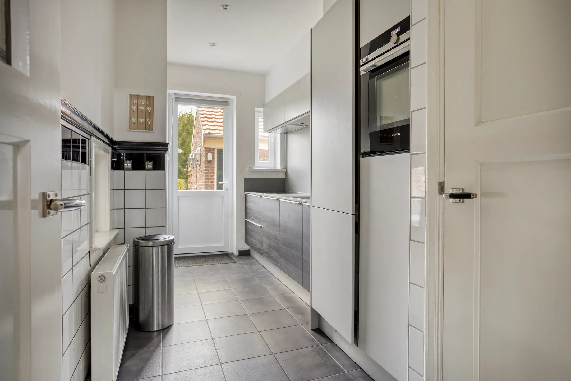 Bij binnenkomst valt direct de stijlvolle hal op met authentieke deuren en fraaie tegelvloer. De recent geplaatste keuken combineert strakke moderne lijnen met hoogwaardige apparatuur, waaronder een keramisch werkblad, inductiekookplaat, afzuigkap, vaatwasser, koelkast en combi-oven.